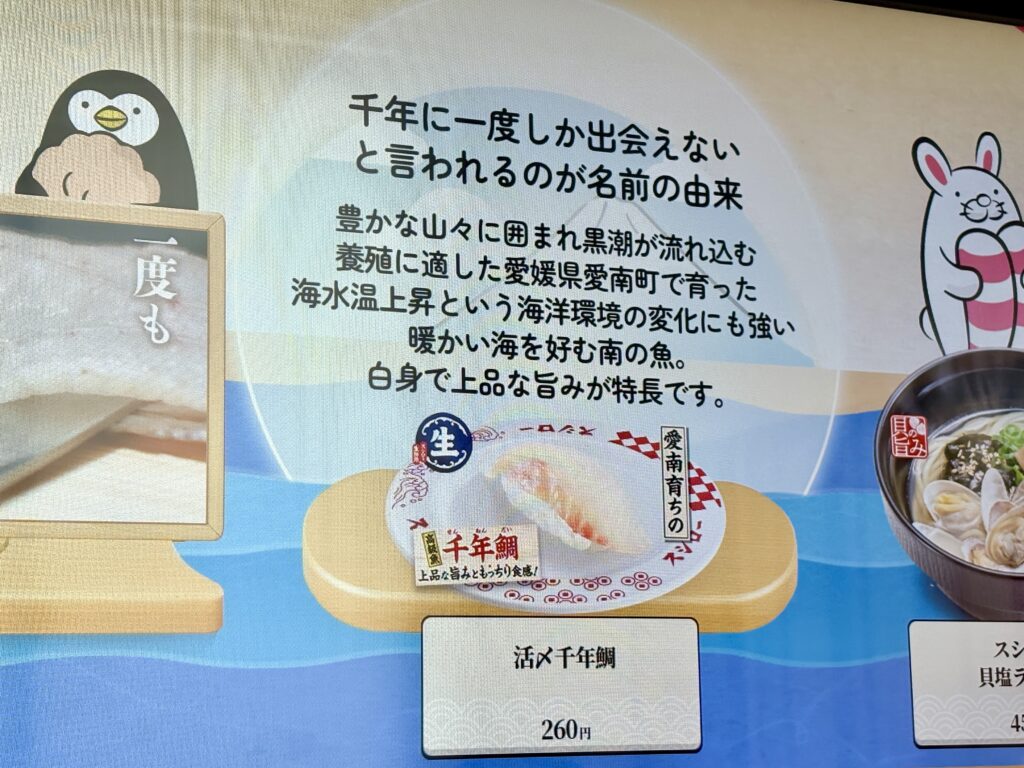 「活〆千年鯛」を見かけたらラッキーなので、ぜひスシローに行った際は探してみてください。