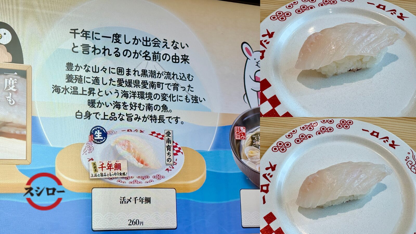 以上、スシロー【幻の一貫】「活〆千年鯛」出会えたらラッキー!、という記事でした。