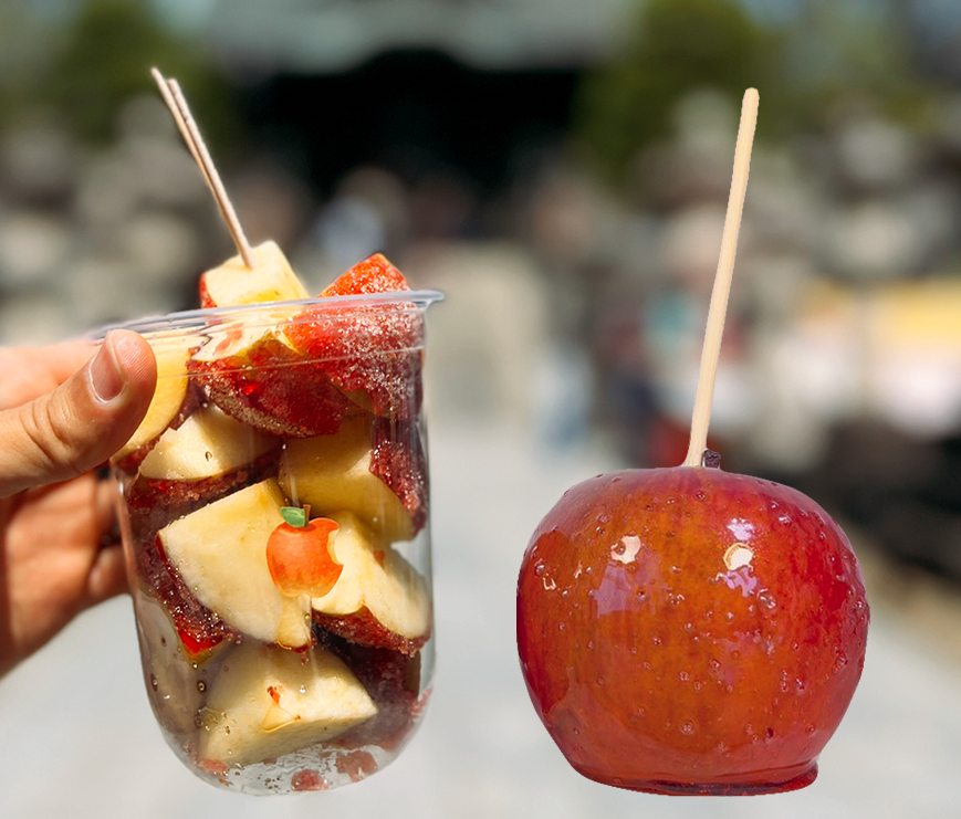 りんご飴はまるまる1個買うこともできますが、カットもしてくれるので食べやすいです。