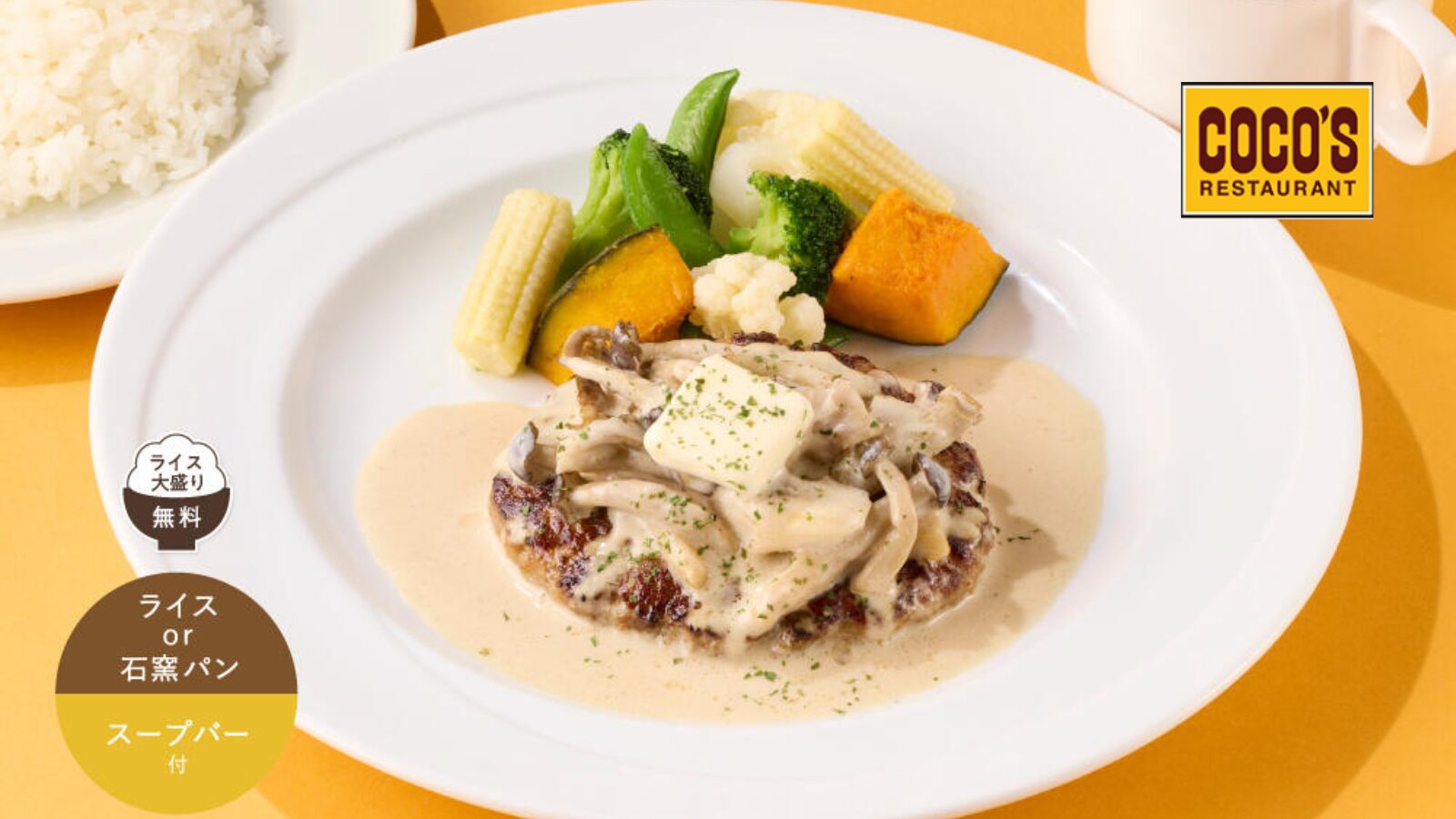 ココスの平日ランチタイム(10:00~15:00)限定「2025秋のランチメニュー」から『きのこクリームのハンバーグランチ』をいただきました。