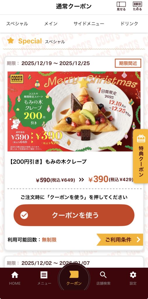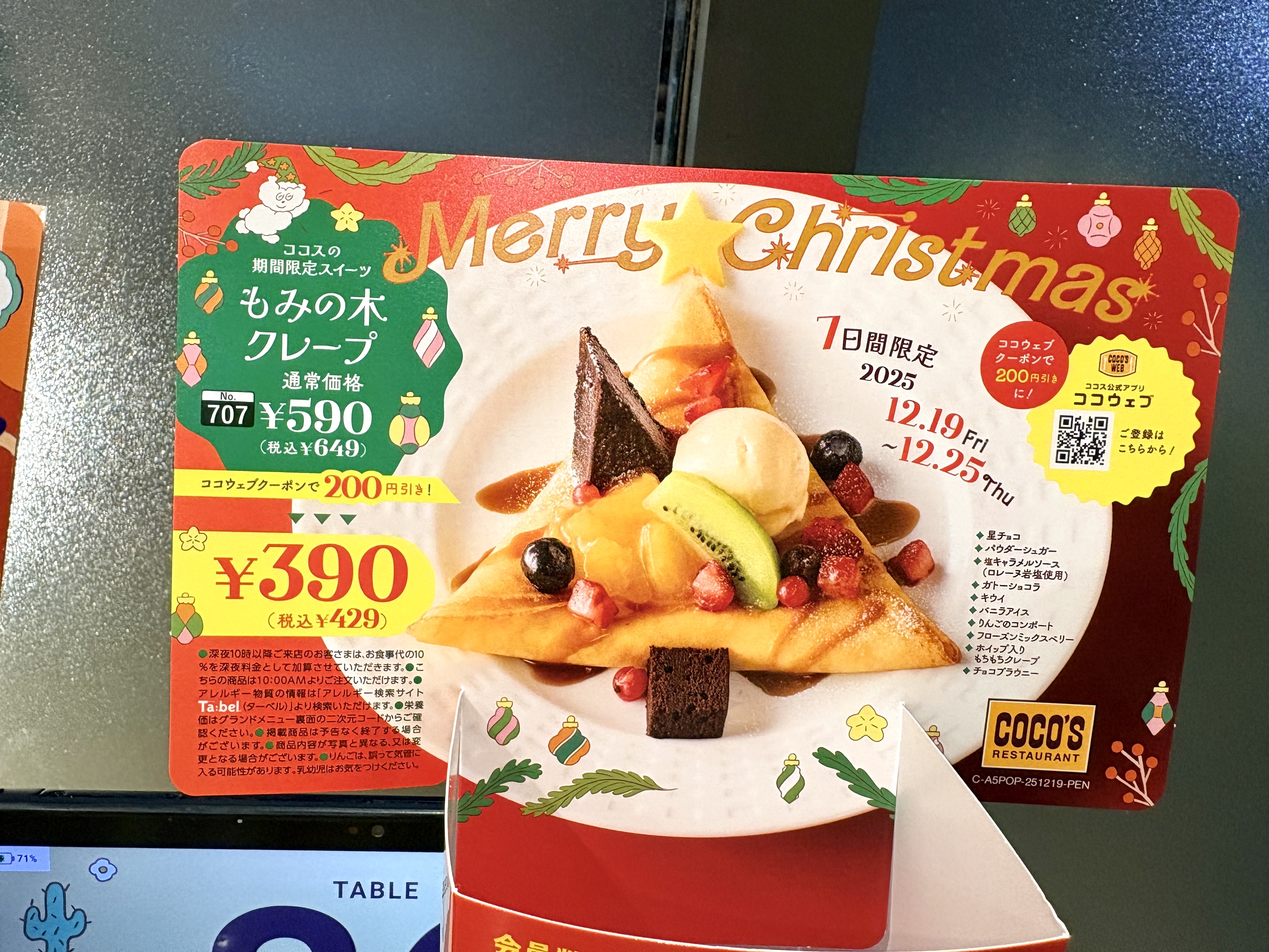 - ココスの期間限定スイーツ「もみの木クレープ」は、12月25日(木)23:59まで!