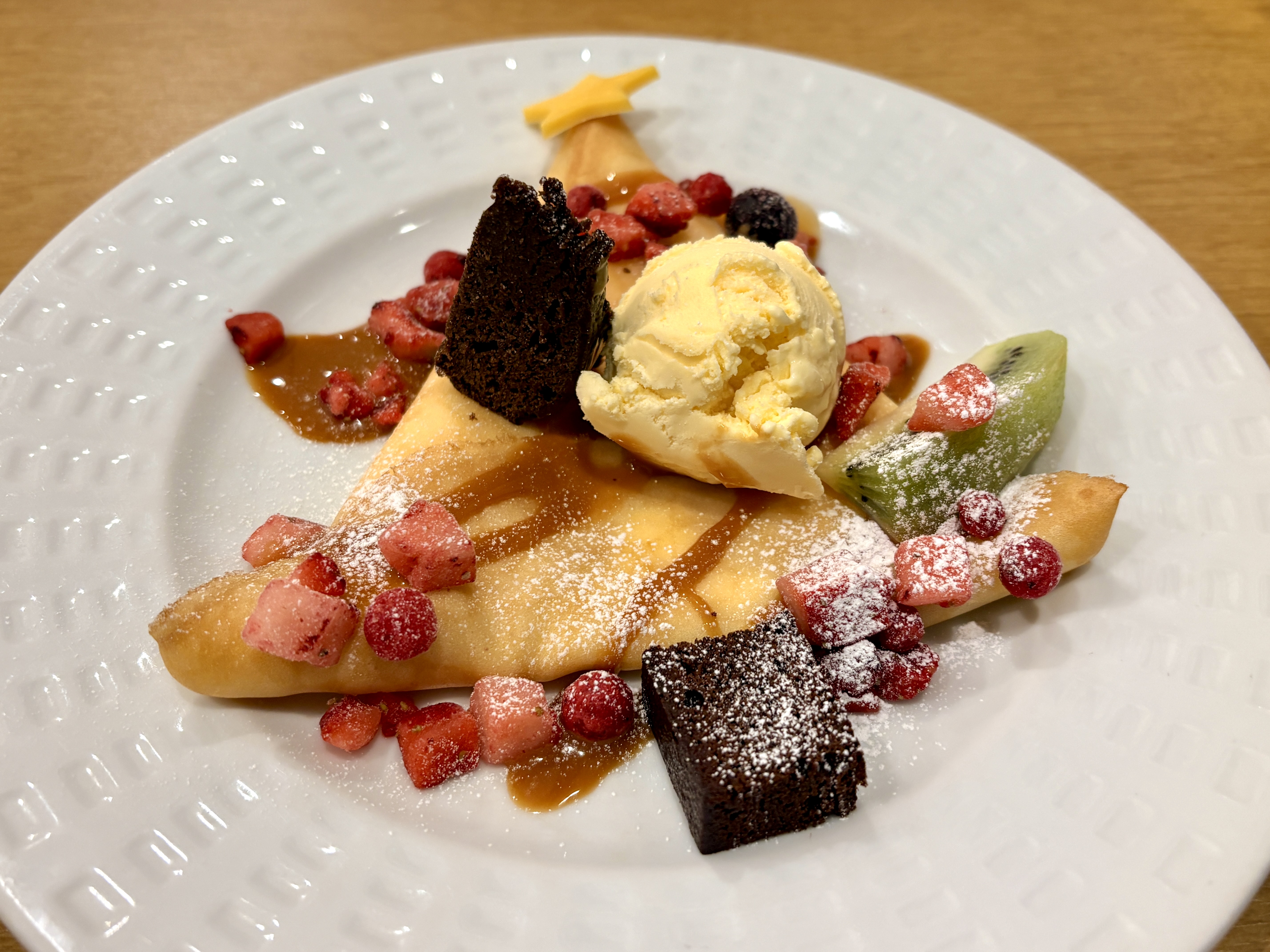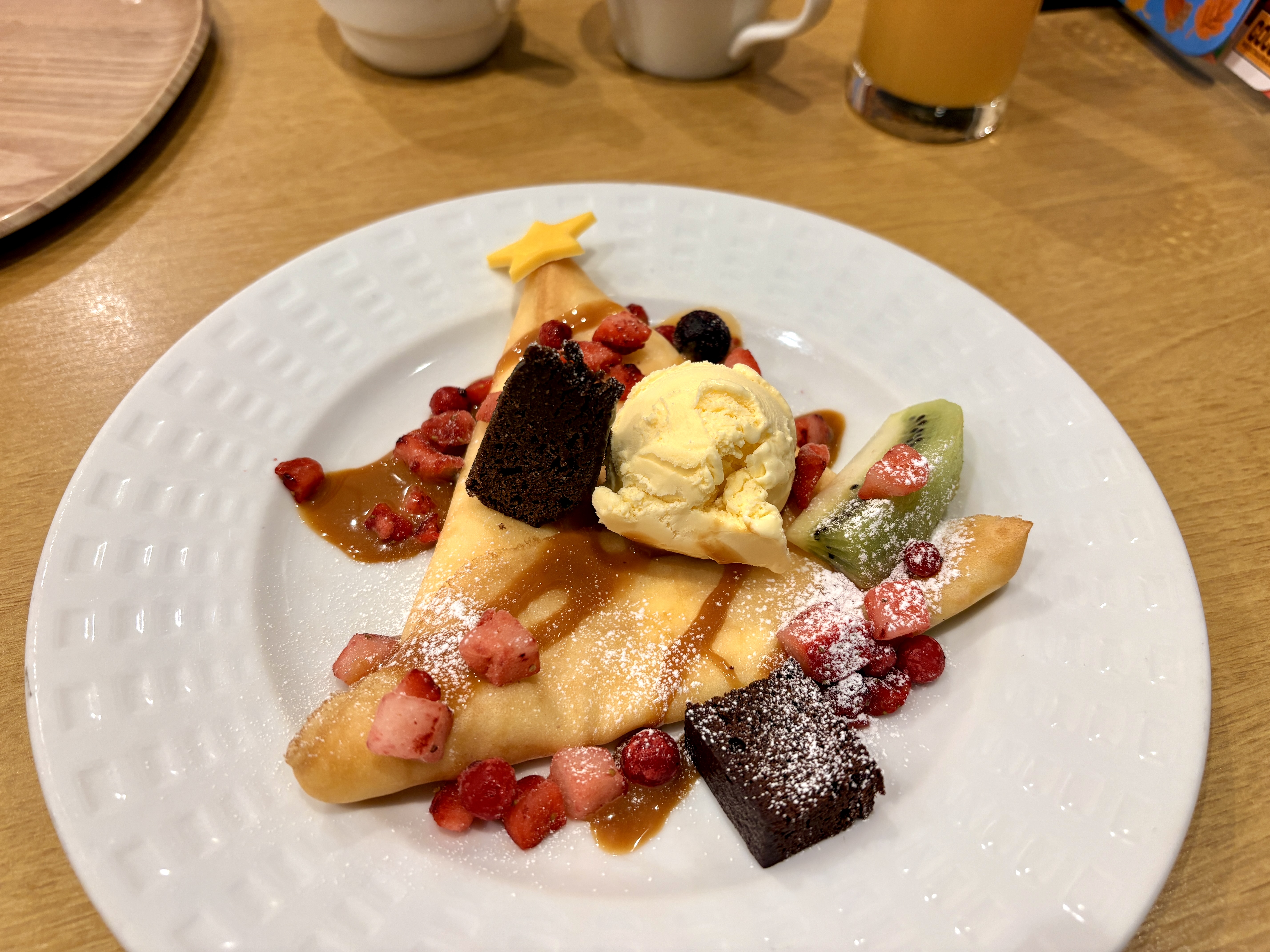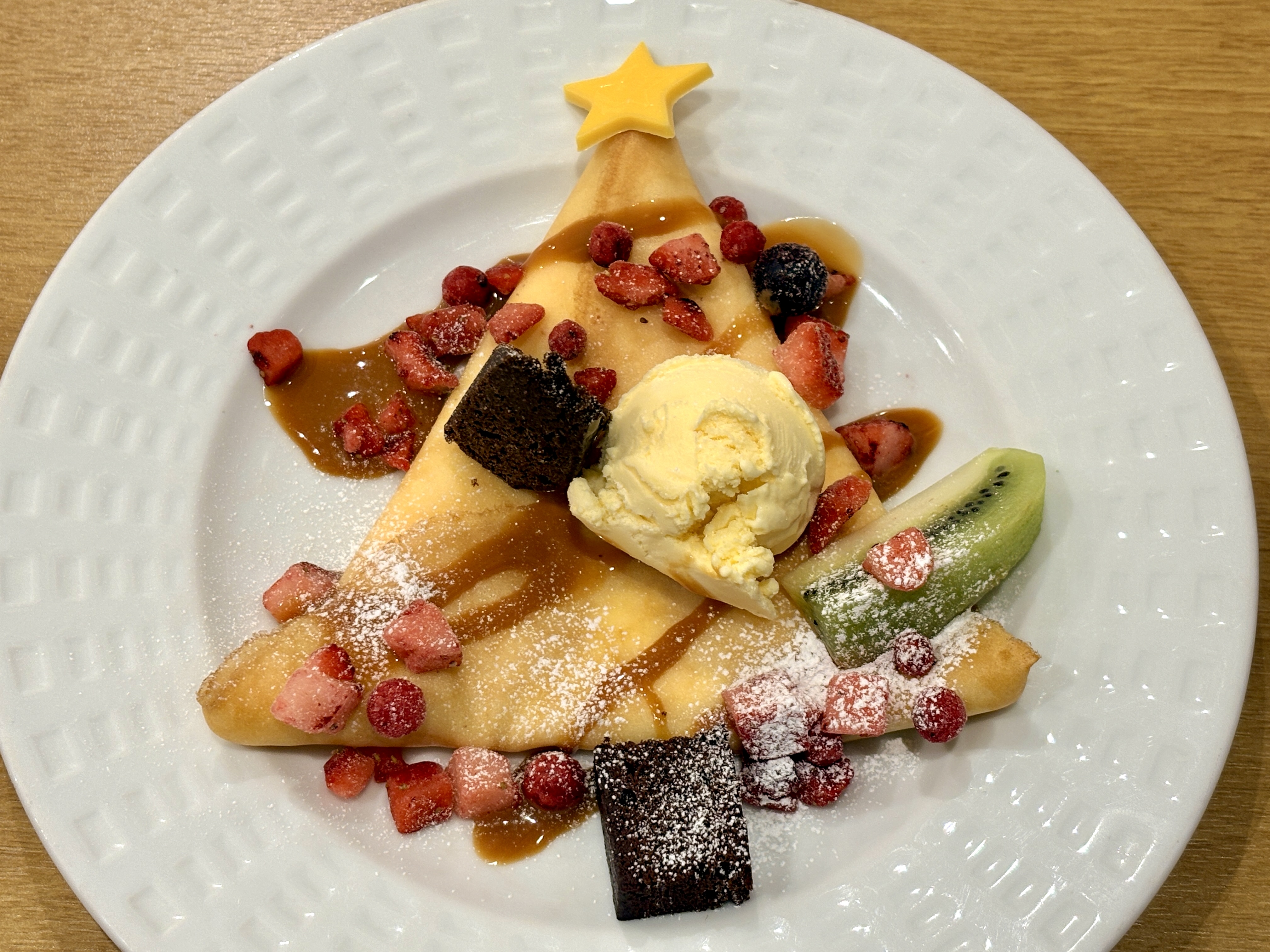 ホイップをもちもちのクレープで包み、星チョコやガトーショコラ、キウイ、バニラアイス、りんごのコンポート、フローズンミックスベリーをまるでクリスマスツリーの様に飾り付けました。