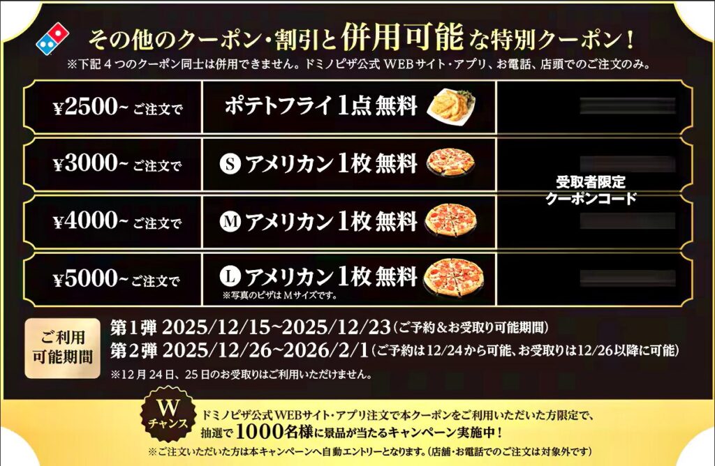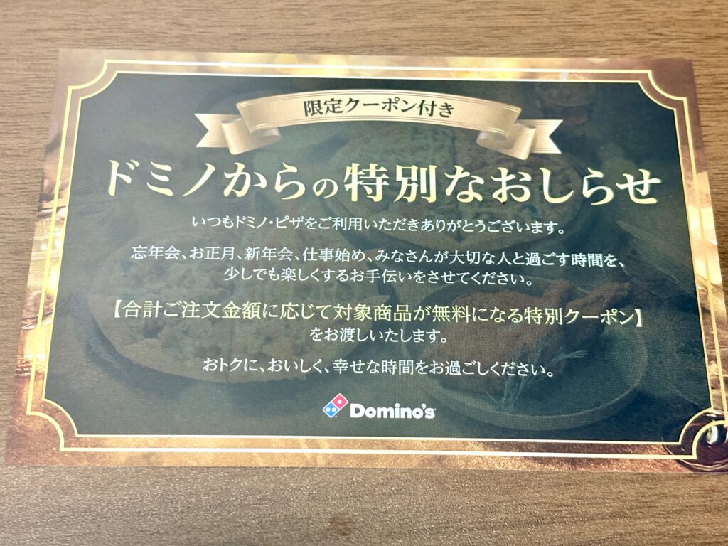 ピザを食べた際に「年末年始お客様感謝クーポン」をもらったので紹介していきます。