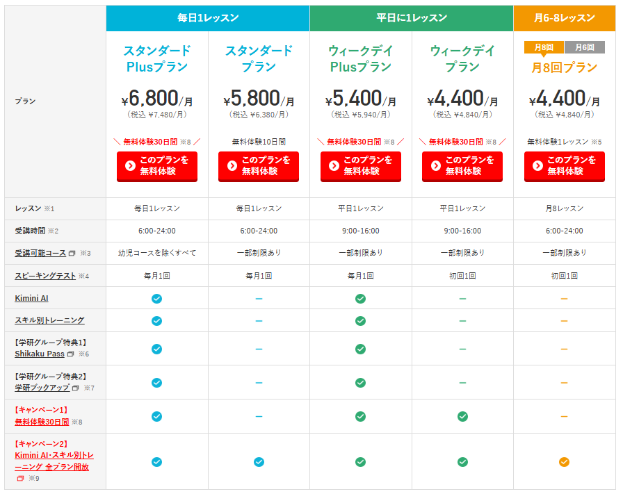 これらはどのプランでも30日間の無料体験レッスンではじめられます。ただし『ウィークデイプラン』『ウィークデイPlusプラン』は、毎日レッスンが受けられなかったり(月‐金のみ)、レッスンを受けられる時間枠が短め(9-16時)なので、気をつけましょう。