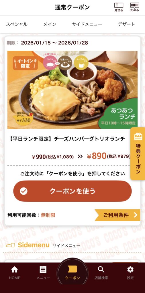 - ココウェブ会員は、クーポンの利用で100円引きでさらにお得に食べられる!