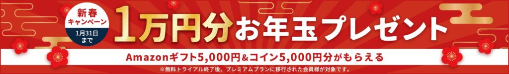 上記バナーの一番下※にあるように、無料トライアル終了後、1/31(土)までにプレミアムプランに登録した方が「1万円分のお年玉プレゼント」の対象になるようです。
