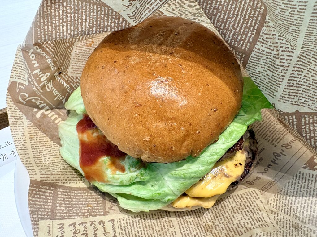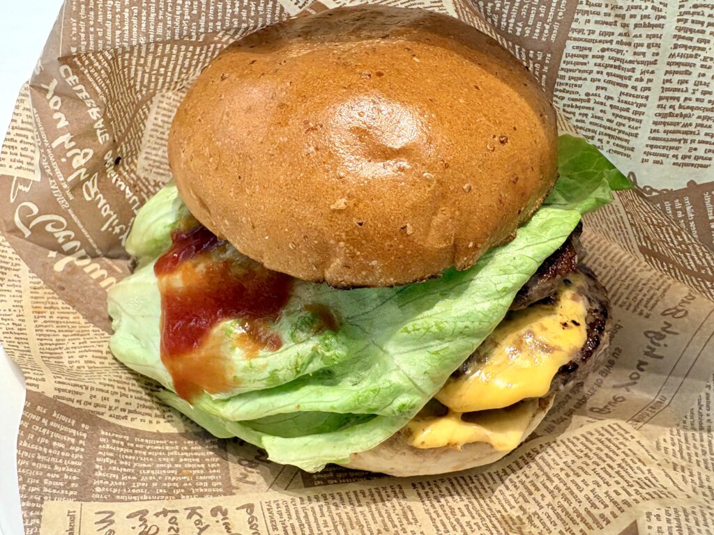 肉が3枚も入った肉肉しいハンバーガーです。顎が外れてしまうくらいの圧倒的な厚みです。