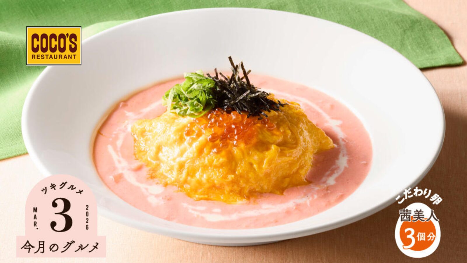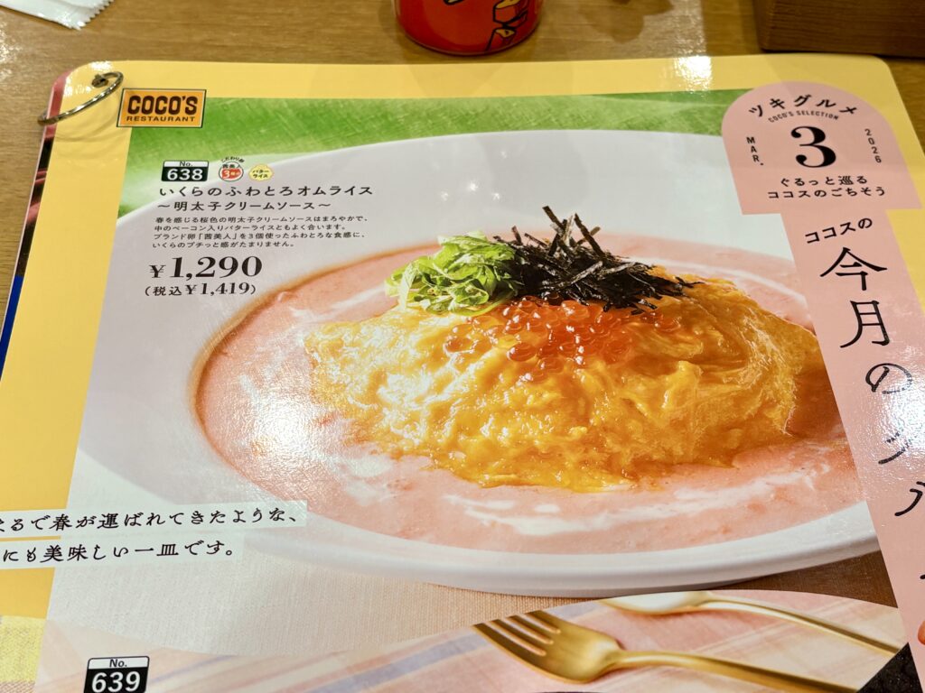 以上、ココス【春らしいさわやか系オムライス】3月のグルメ「いくらのふわとろオムライス~明太子クリームソース~」、という記事でした。
