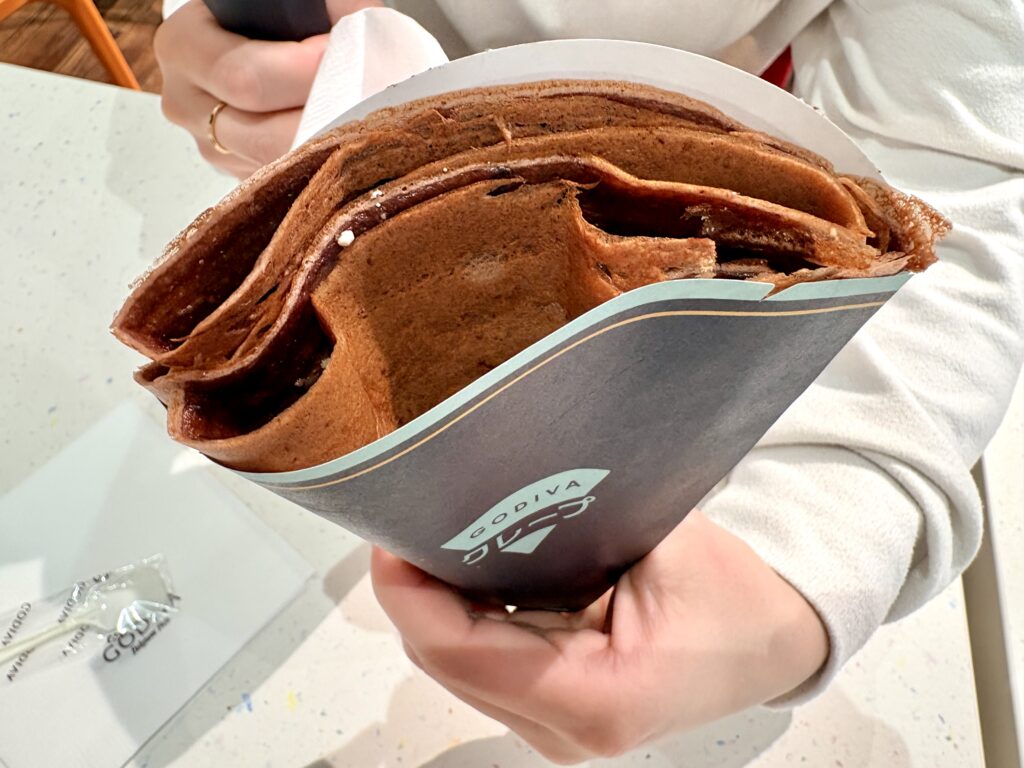 ゴディバのチョコレートを生地にまでふんだんに使ったクレープを食べることができます。