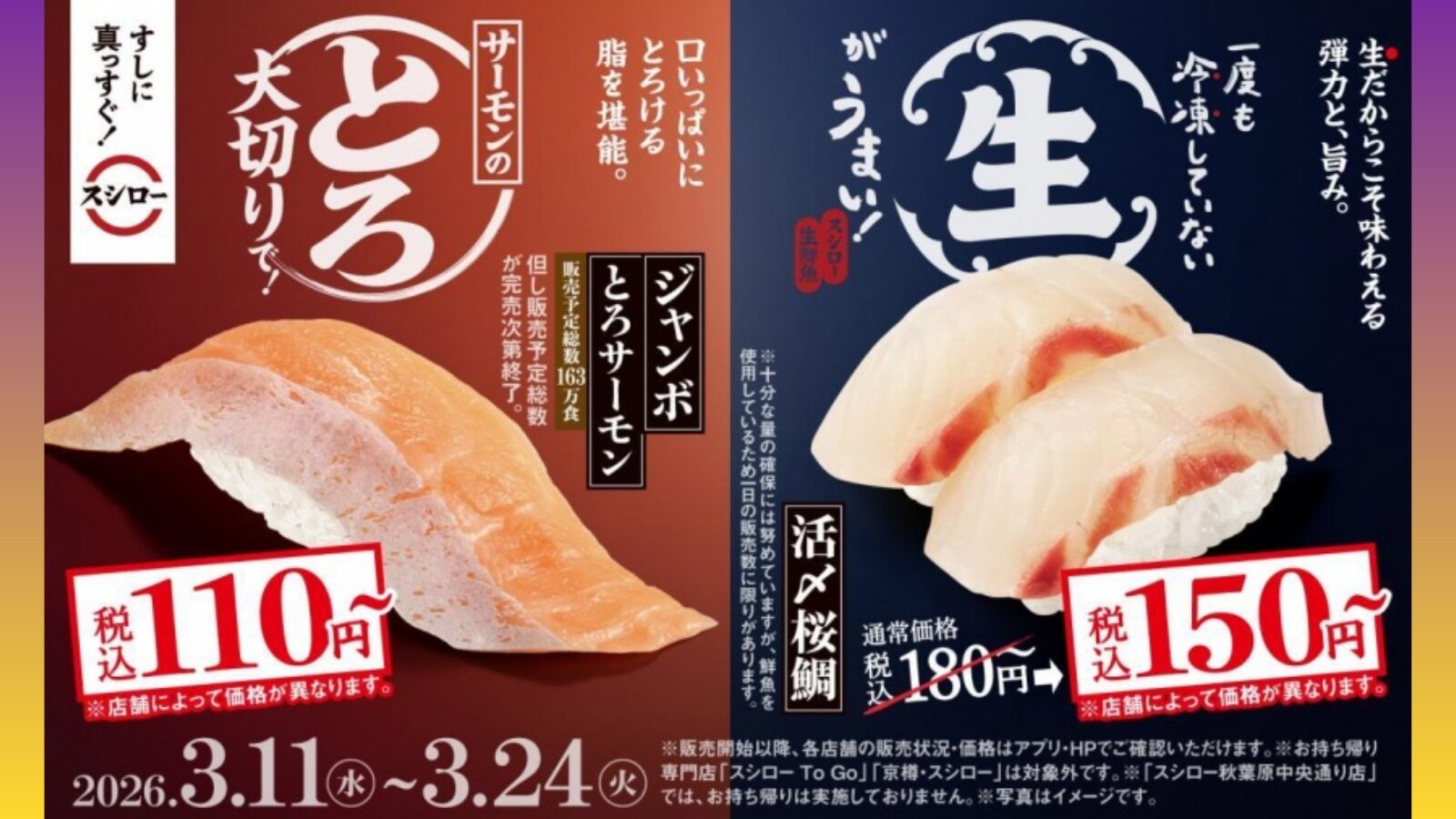 - 「活〆桜鯛(税込160円~)」&「ジャンボとろサーモン(税込120円~)」の特別価格は、2026年3月24日(火)まで!
