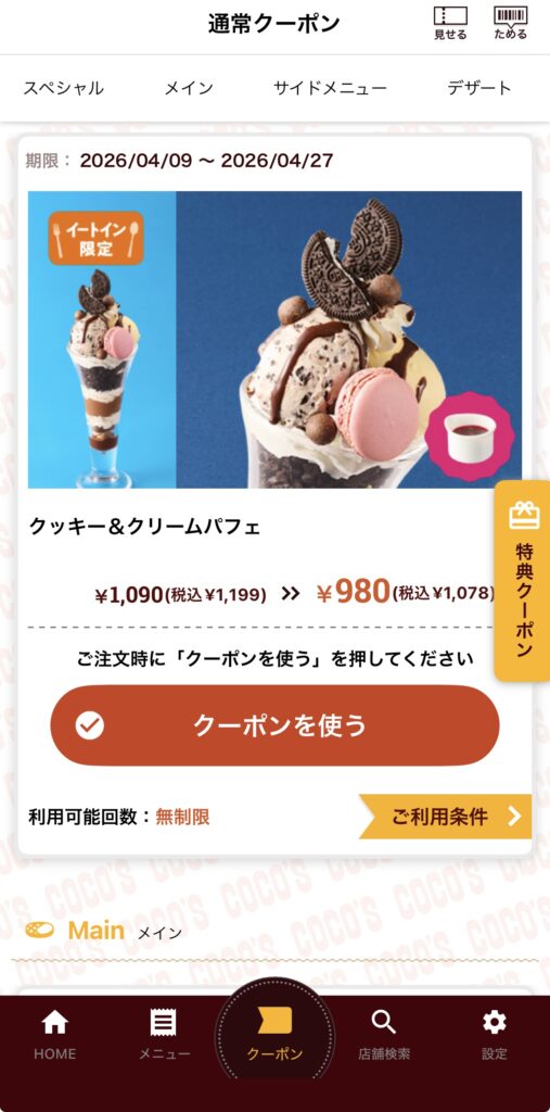 ココス スペシャルデザートクーポン 再び