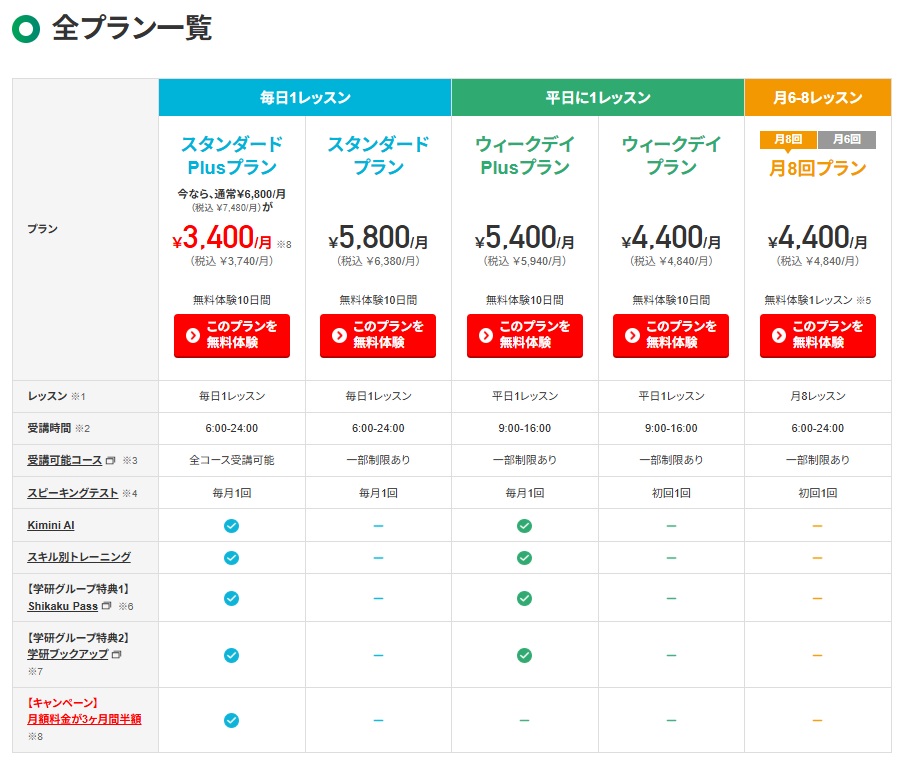 上記枠内はどのプランでも10日間の無料体験レッスンではじめられます。ただし「ウィークデイプラン」「ウィークデイPlusプラン」は、毎日レッスンが受けられなかったり(月‐金のみ)、レッスンを受けられる時間枠が短め(9-16時)なので、「ウィークデイプラン」ではじめる方は気をつけましょう。