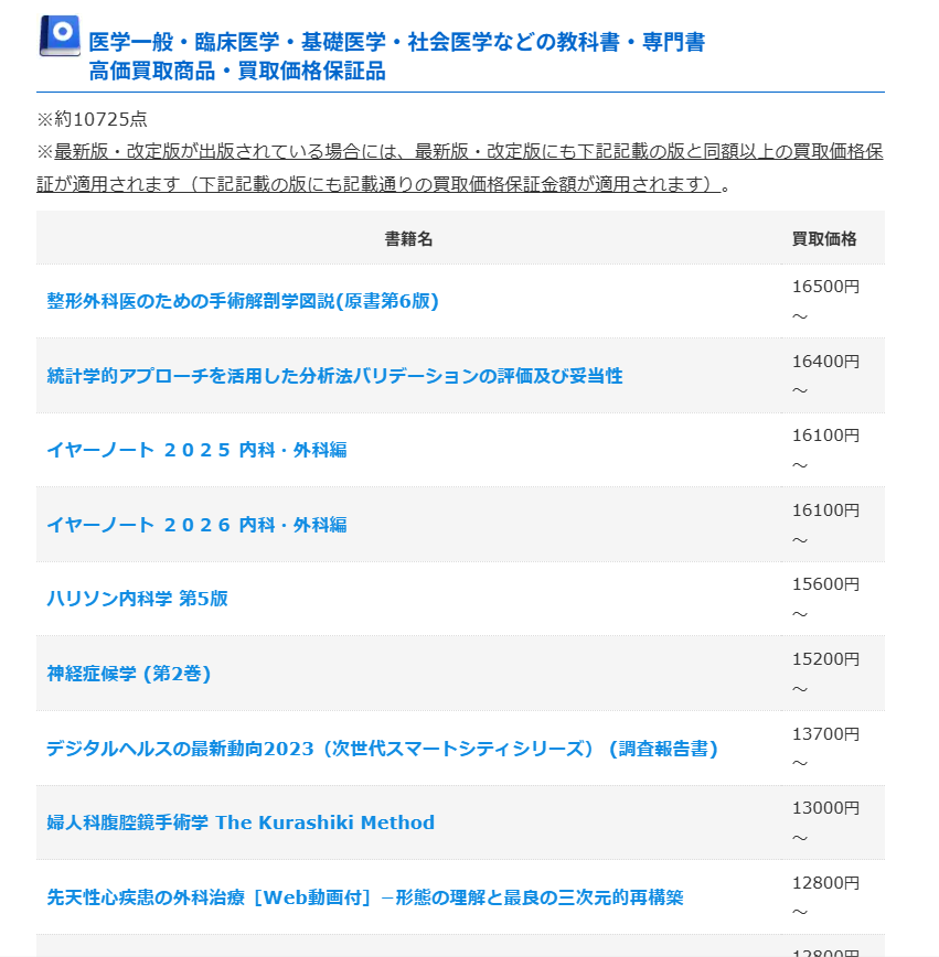 さらに、医学書・医学専門書、医療系国家試験・資格試験対策参考書・問題集、薬学・生化学・生理学・生物学の教科書・専門書の高価買取商品・買取価格保証商品があります。先輩からもらったもの、もう古いよねって思うものでも高値で買い取ってもらえる可能性があるのでぜひ確認してみてください。
