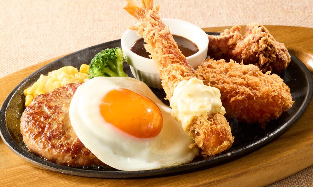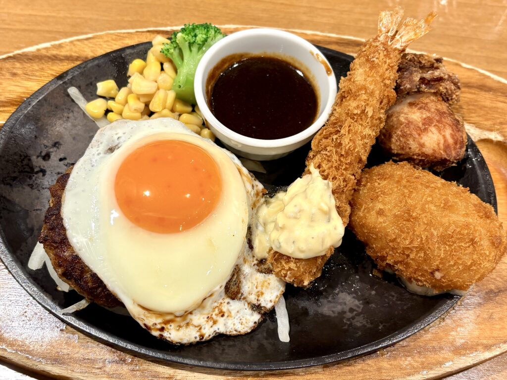 ハンバーグに目玉焼き、海老フライ、カニクリームコロッケ、「本気の唐揚げ」を夢のように盛り合わせた鉄板プレートです。