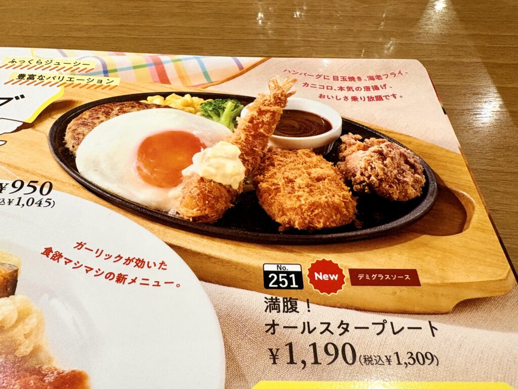 ココス「2026春グランドメニュー」からハンバーグの新メニュー「満腹!オールスタープレート」をいただきました。