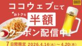 4月14日(火)~4月20日(月)の7日間限定でココウェブ会員様限定のおトクな半額クーポンを配信されます!この機会にココウェブ会員になってお得にココスを楽しみましょう!