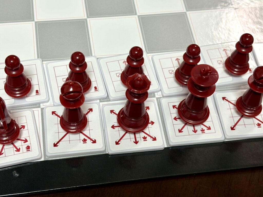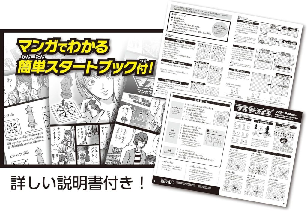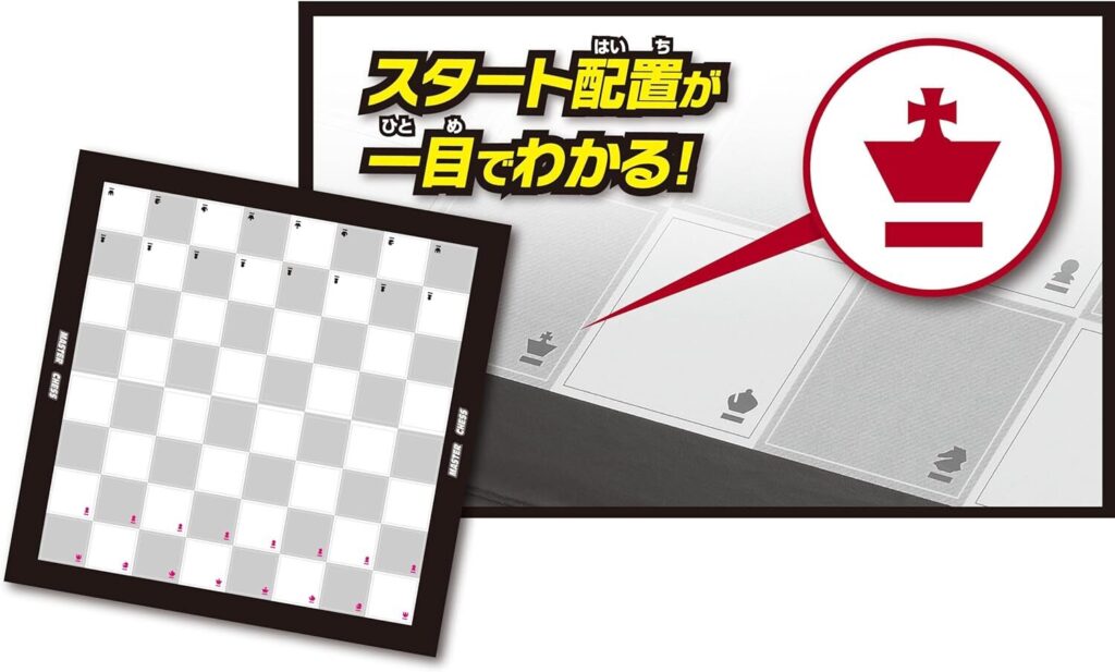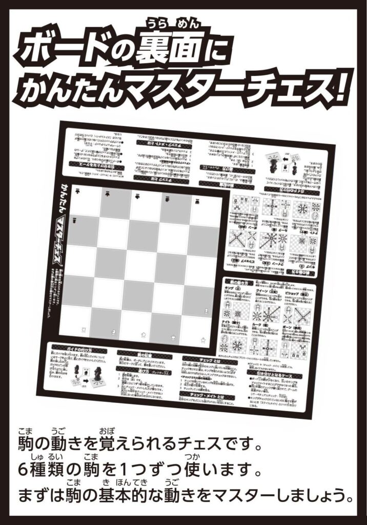 はじめの頃は駒の動き方を練習するためボード裏面のかんたんマスターチェスを使うとより分かりやすいと思います。