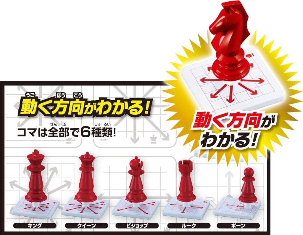 ボードに駒の初期配置が描かれ、駒の動き方も駒の台に描かれた矢印で表現されているため、5歳と幼いながらも見て理解できるので大人と一緒に遊ぶことができます。