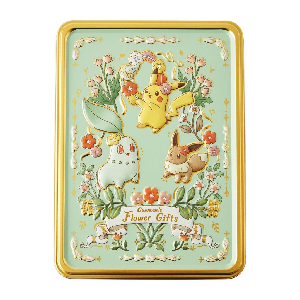 また、お花がちりばめられた上品なデザインの缶は、洗練されたエンボス加工になっていて、キュワワーやお花をつけてもらったピカチュウ・イーブイ・チコリータが描かれているよ。