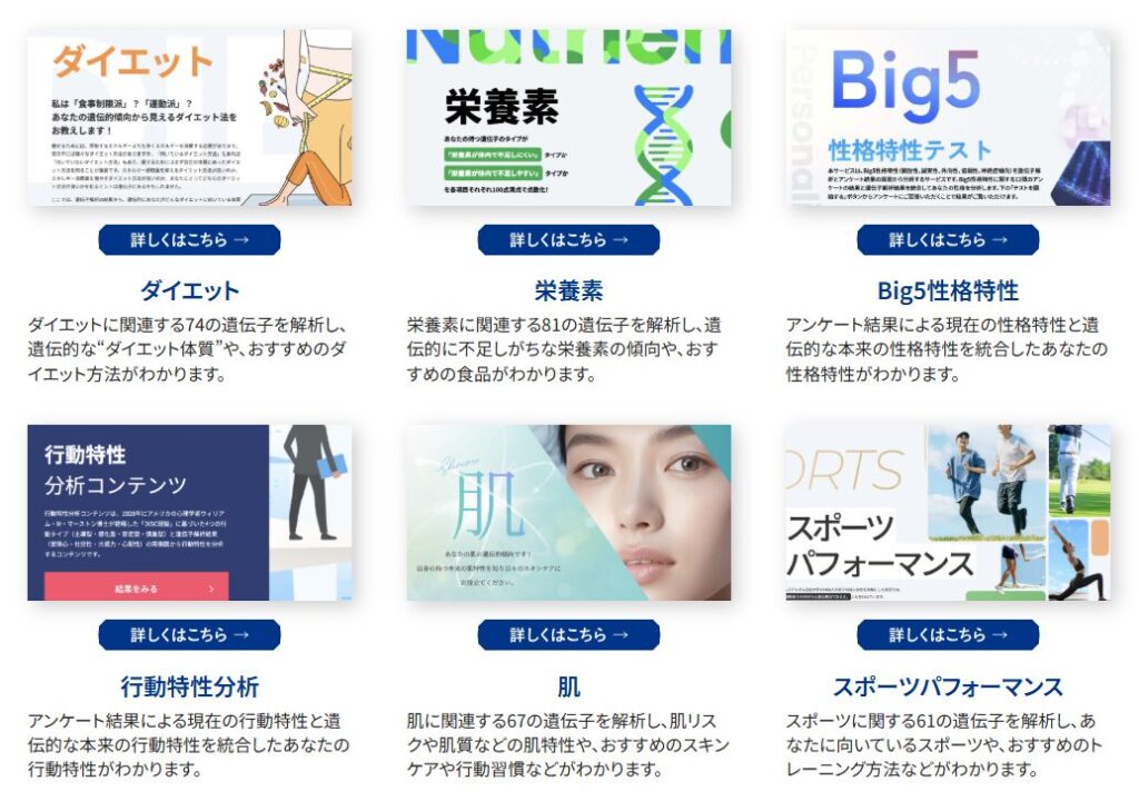 日常で気になる項目に関連した遺伝的傾向を1つにまとめた、自分だけのスペシャルコンテンツです。