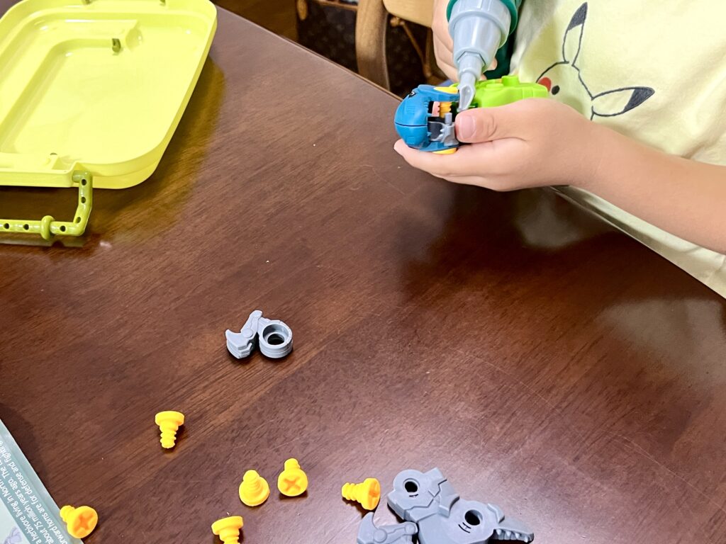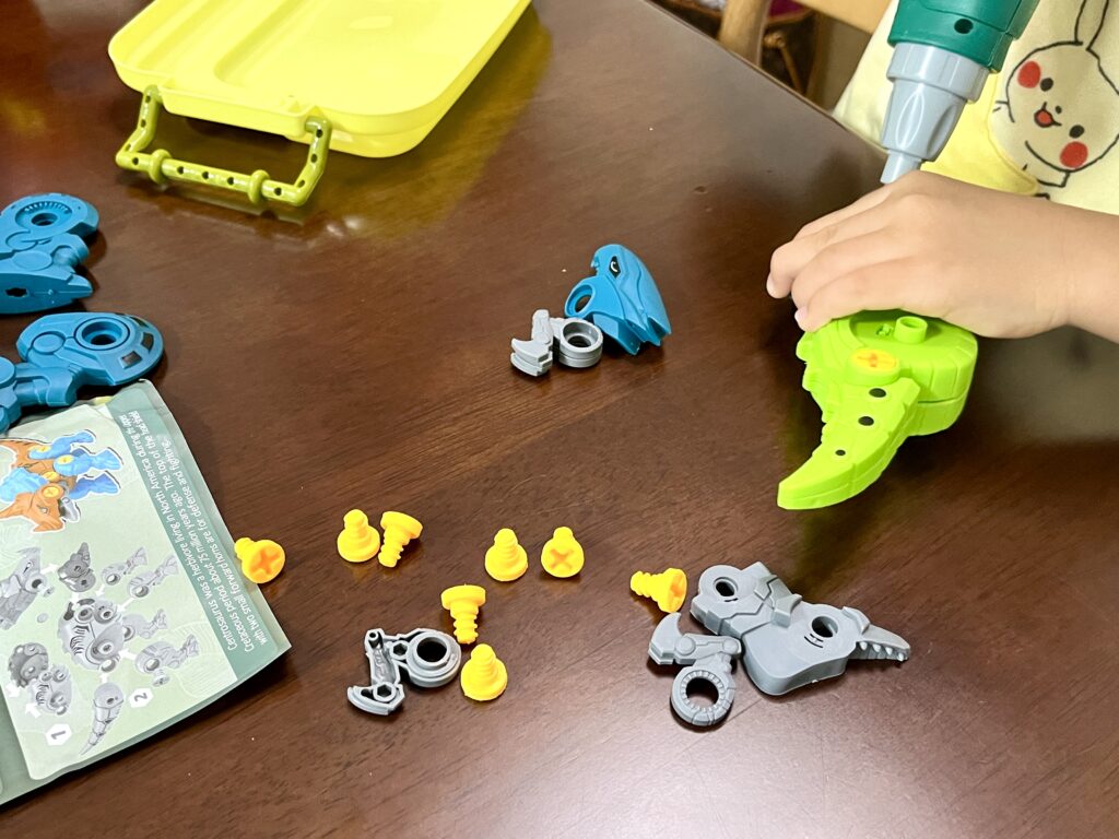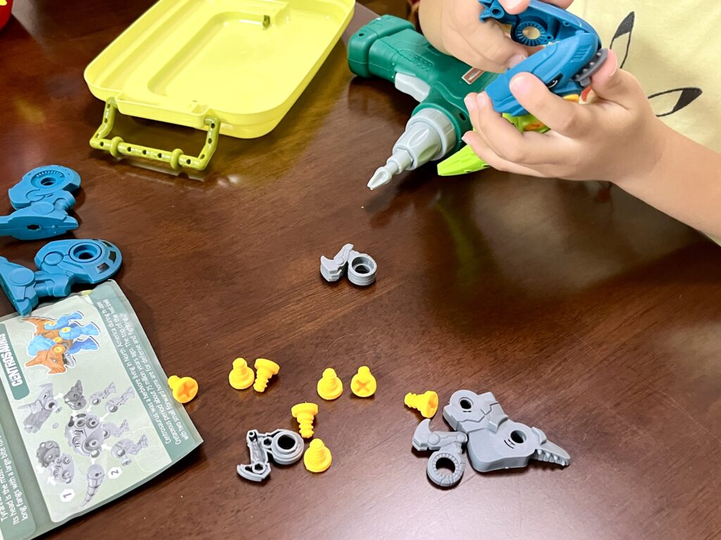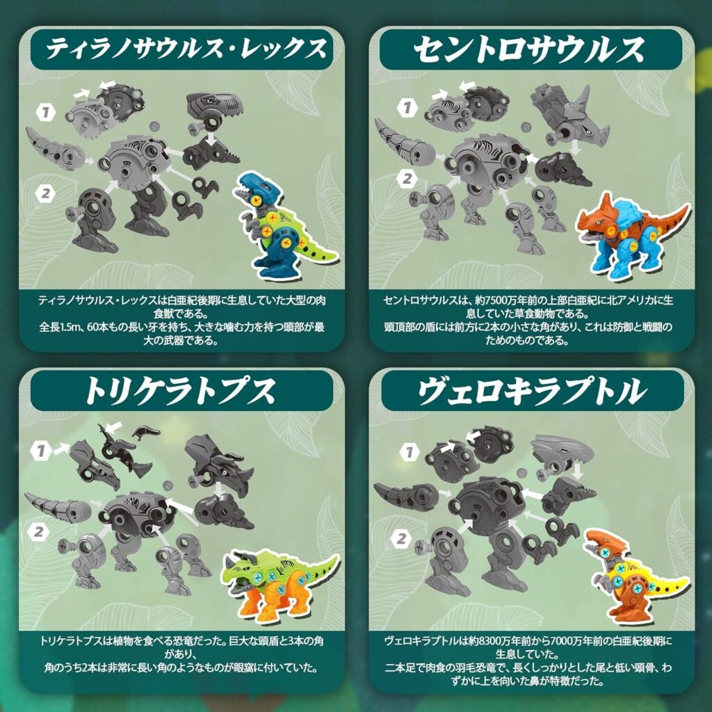 設計図を見て、電動ドリルなどの工具を使い恐竜を組み立てていくおもちゃです。