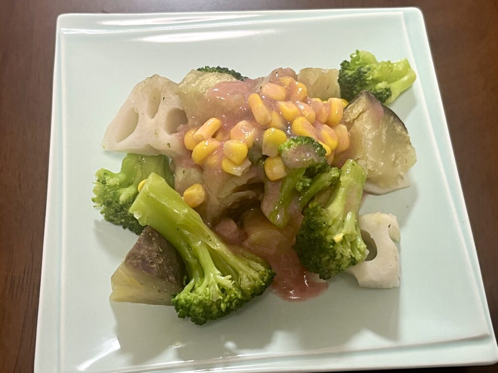 レンジで温めるだけで完成する「デリOisix」から、『温野菜のピンクシーザードレッシング』をいただきました。