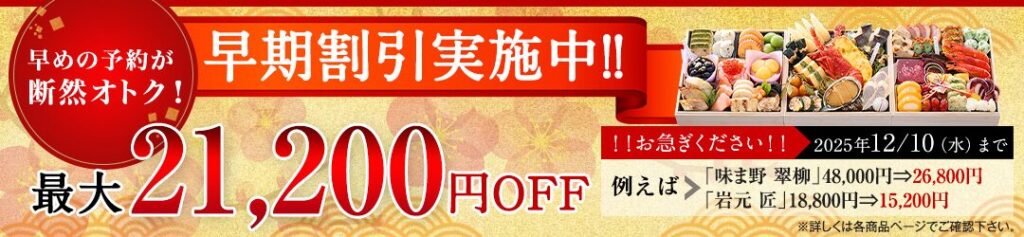 - 割引率が高く、人気料亭のおせちから先に完売するため注意!