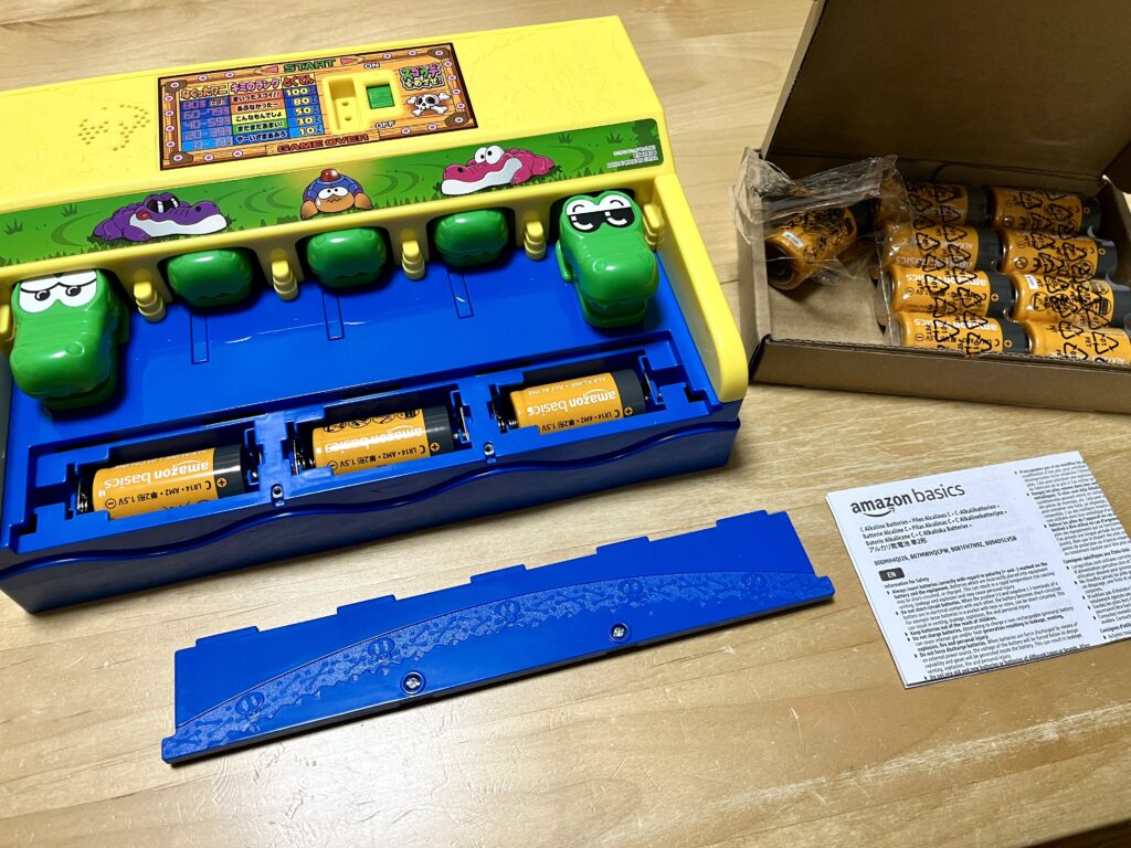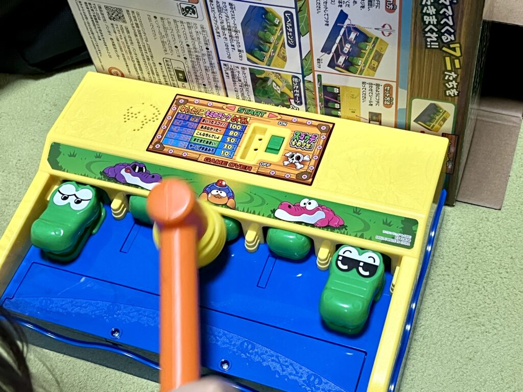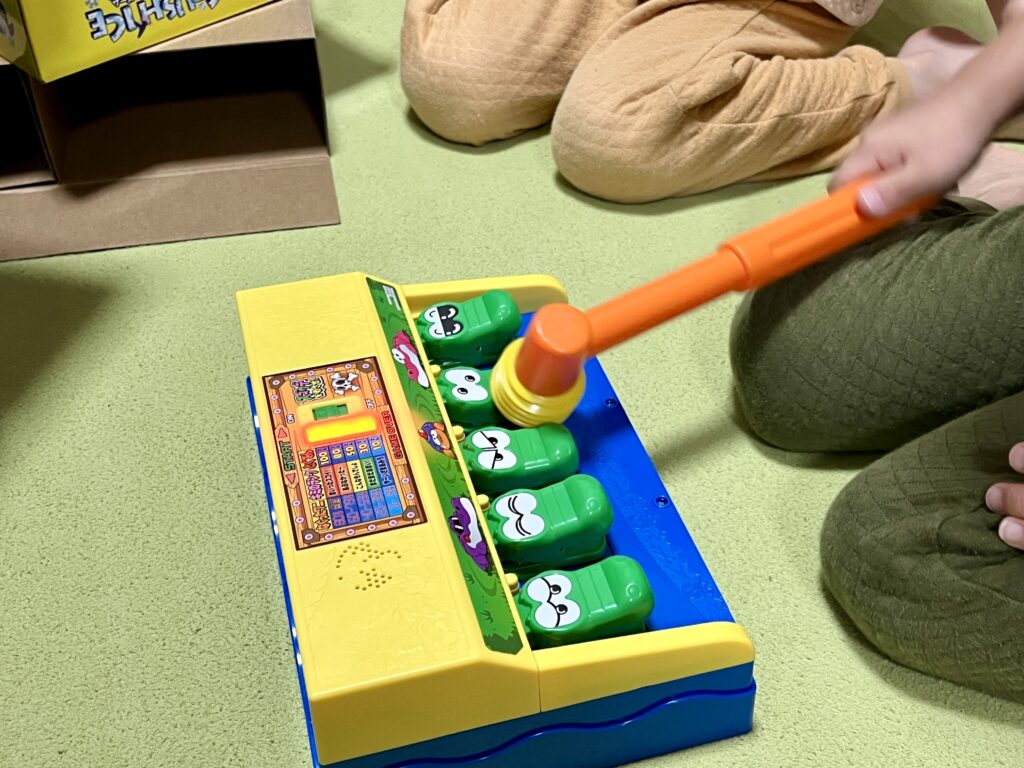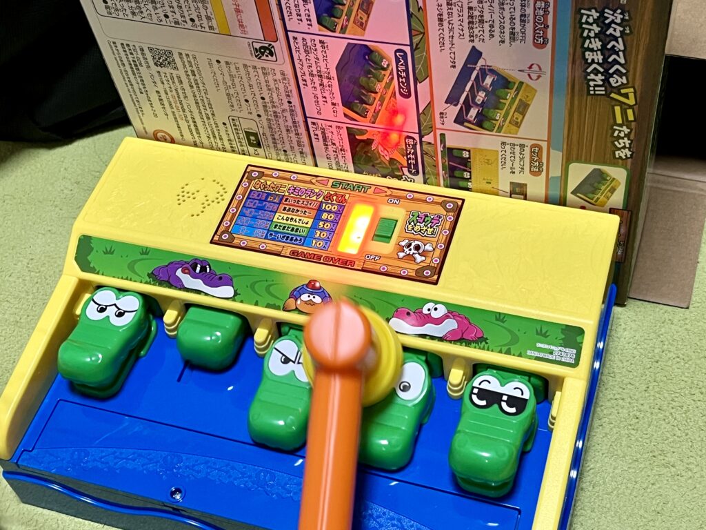 子どもは最初まったくワニを叩くことができませんでしたが、回数を重ねてくうちに、ワニが動いた瞬間にハンマーを振り下ろし、あっという間に高得点になっていました。ちょっとの動きでも捉えることができる子どもの目がとても良いことに驚かされました!